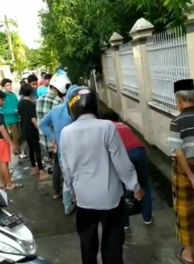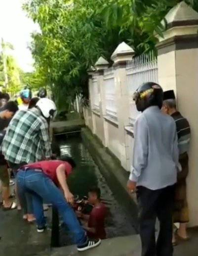 Melihat ada remaja yang tercebur ke dalam got, para warga pun datang dan membantunya. Terlihat beberapa orang warga dan teman remaja itu berusaha membantunya untuk naik.