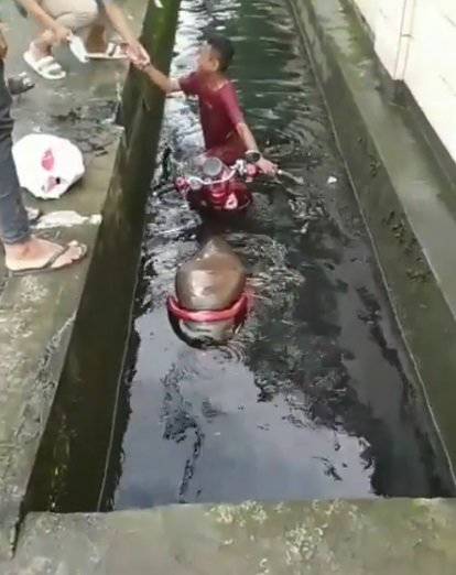 Ia tampaknya tak dapat mengendalikan motor hingga akhirnya tercebur ke dalam got. Sontak saja, para warga pun datang ke lokasi kejadian.
